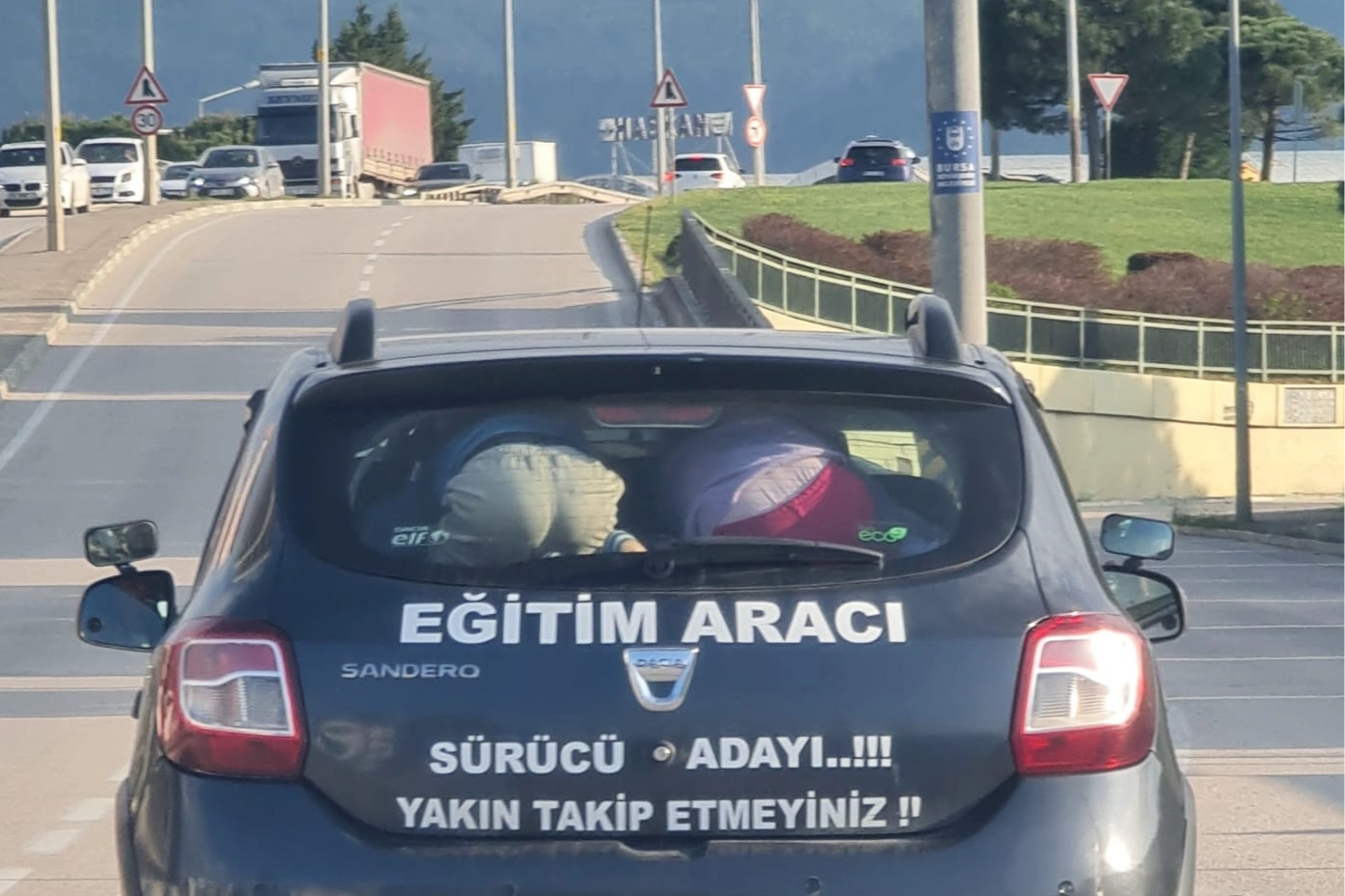 #Bursa'nın Nilüfer ilçesine bağlı Özlüce Mahallesi'ndeki kavşağında, seyir halindeki bir otomobilin içinde çocukların bulunduğu görüntü, diğer sürücüleri hayrete düşürdü. Bu aracın bir sürücü kursuna ait olması ise dikkatlerden kaçmadı.