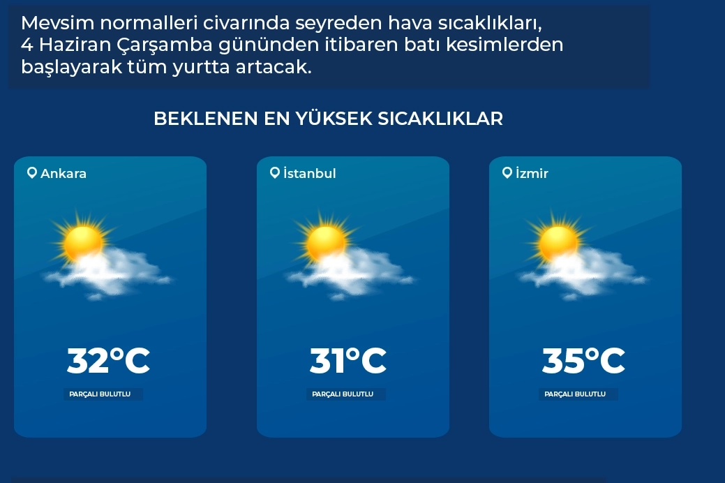5-9 Haziran 2025 tarihleri arasında 3 büyük ilde tahmin edilen en yüksek hava sıcaklıkları şöyle olacak; Ankara: 32 derece / İstanbul: 31 derece / İzmir: 35 derece.