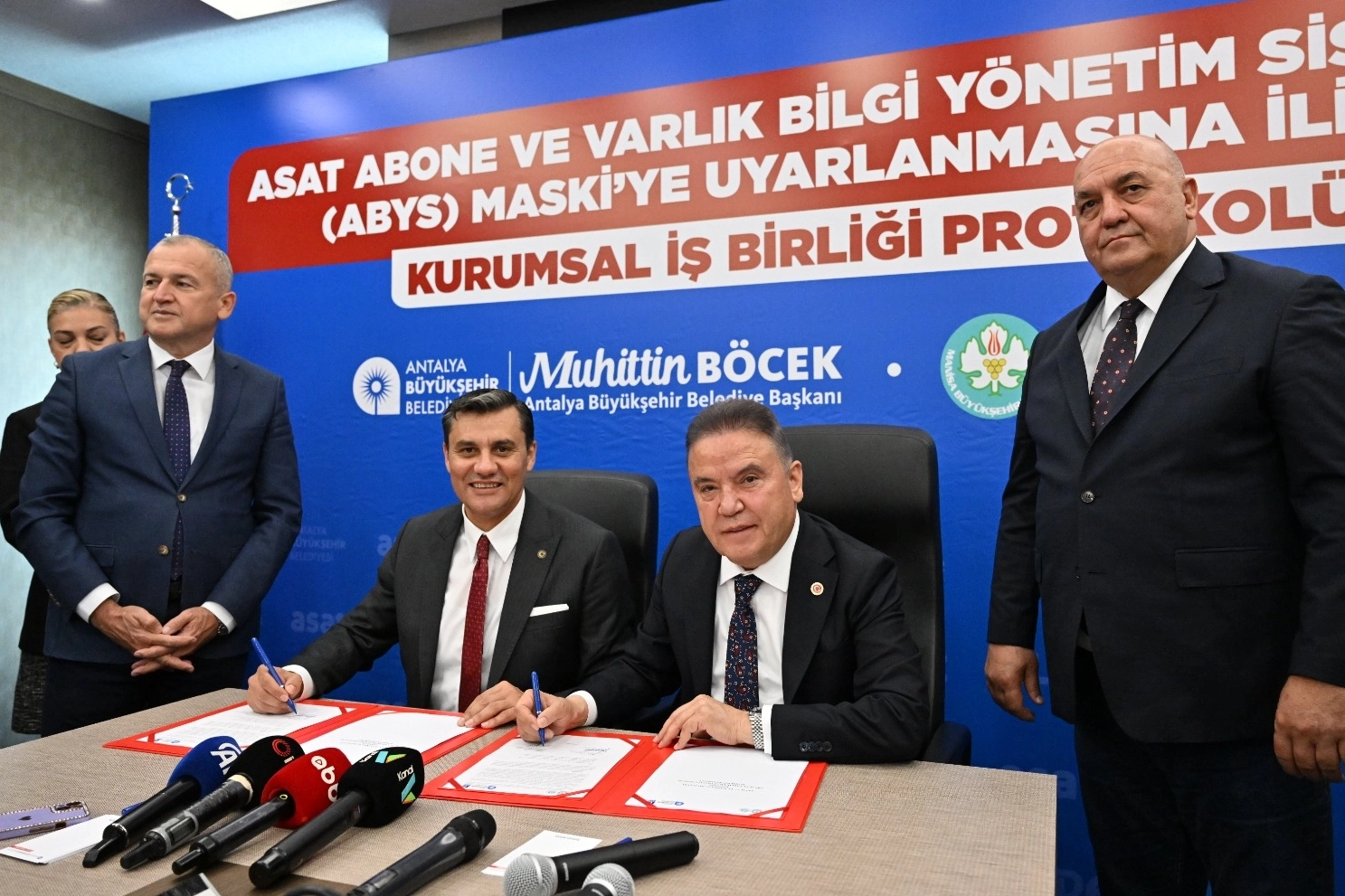 Antalya’da düzenlenen imza törenine Manisa Büyükşehir Belediye Başkanı Ferdi Zeyrek, Antalya Büyükşehir Belediye Başkanı Muhittin Böcek, Manisa Büyükşehir Belediyesi Genel Sekreteri Burak Deste, MASKİ Genel Müdürü Talat Postacı ASAT Genel Müdürü İbrahim Kurt ve ALDAŞ Genel Müdürü Kıvanç Kuzay katıldı.