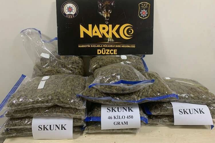 Araçta arama yapan ekipler, 13 parça halinde toplam 46 kilo 450 gram "skunk" ele geçirdi.