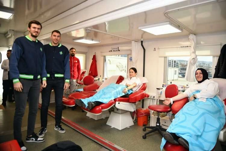 BURSA (İGFA) - Tofaş Spor Salonu seyirci otopark alanında oluşturulan Türk Kızılay kan bankası, Bursa derbisi öncesinde kan bağışı kampanyasına destek veren Bursalı basketbol severlerden ilgi gördü.