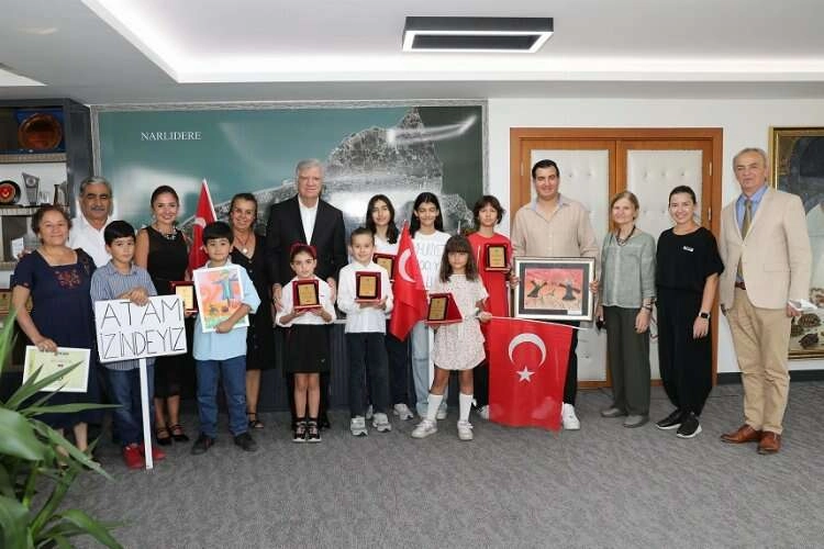 İZMİR (İGFA) - Cumhuriyetimizin 100.yılında katıldıkları uluslararası yarışmalardan 7 dünya birinciliği ve çeşitli derecelerle dönen Narlıdere Belediyesi Çocuk Resim Kursu öğrencileri, Narlıdere Belediye Başkanı Ali Engin’i ziyaret etti. Ödül alan başarılı öğrencileri ve ailelerini makamında ağırlayan Başkan Engin, çocukları tek tek tebrik ederek başarılarının devamını diledi.
