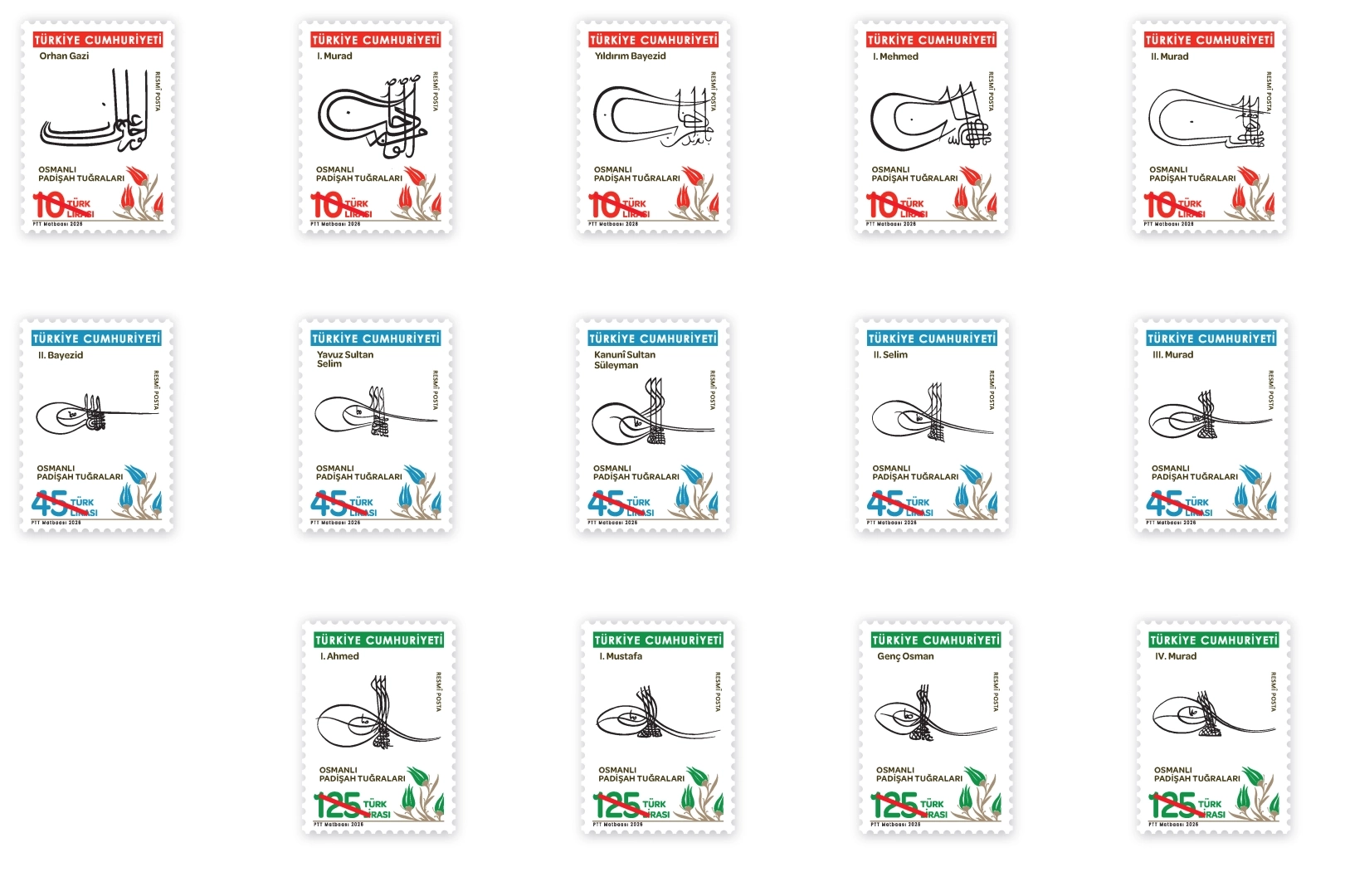 ANKARA (İGFA) - PTT AŞ, 3 Mart 2026 tarihinde “Osmanlı Padişah Tuğraları” konulu (26x36 mm boyutunda) 6 x 10 TL, 6 x 45 TL, 4 x 125 TL, 4 x 265 TL bedelli resmî posta pullarını PTT iş yerlerinde ve PTT AŞ’ye ait www.filateli.gov.tr web adresinde satışa sundu.