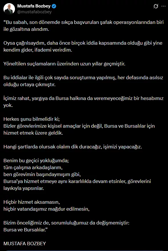 Bursa Büyükşehir Belediye Başkanı Mustafa Bozbey, Bursa Cumhuriyet Başsavcılığı tarafından yürütülen soruşturma kapsamında gözaltına alındı. Bozbey, resmi sosyal medya hesabından ikinci kez açıklama yaparak, "Çağrılsaydım, daha önce olduğu gibi kendim gider ve ifademi verirdim" ifadelerini kullandı.