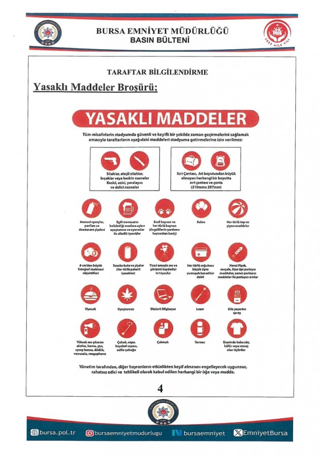 Bursa İl Emniyet Müdürlüğü, 15 Kasım 2025 Cumartesi günü saat 20.00'de Atatürk Spor Kompleksi Matlı Stadyumu'nda oynanacak karşılaşma öncesi taraftarlara bilgilendirmelerde bulundu.