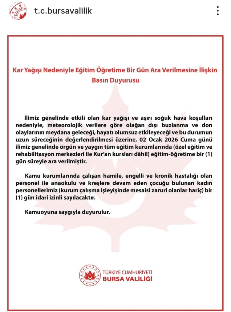 Bursa Valiliği tarafından yapılan açıklamada okulların tatil edildiği açıklandı