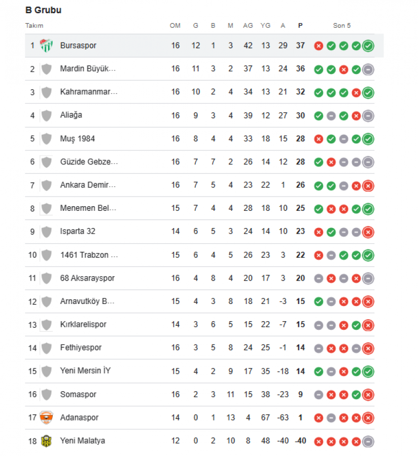 Böylece Türkiye Nesine 2. Lig'de 16. haftanın tamamlanması ile puan cetvelinde Bursaspor 1 puan fark ile Mardin 1969 Spor'u geride bırakarak liderlik koltuğuna oturdu.